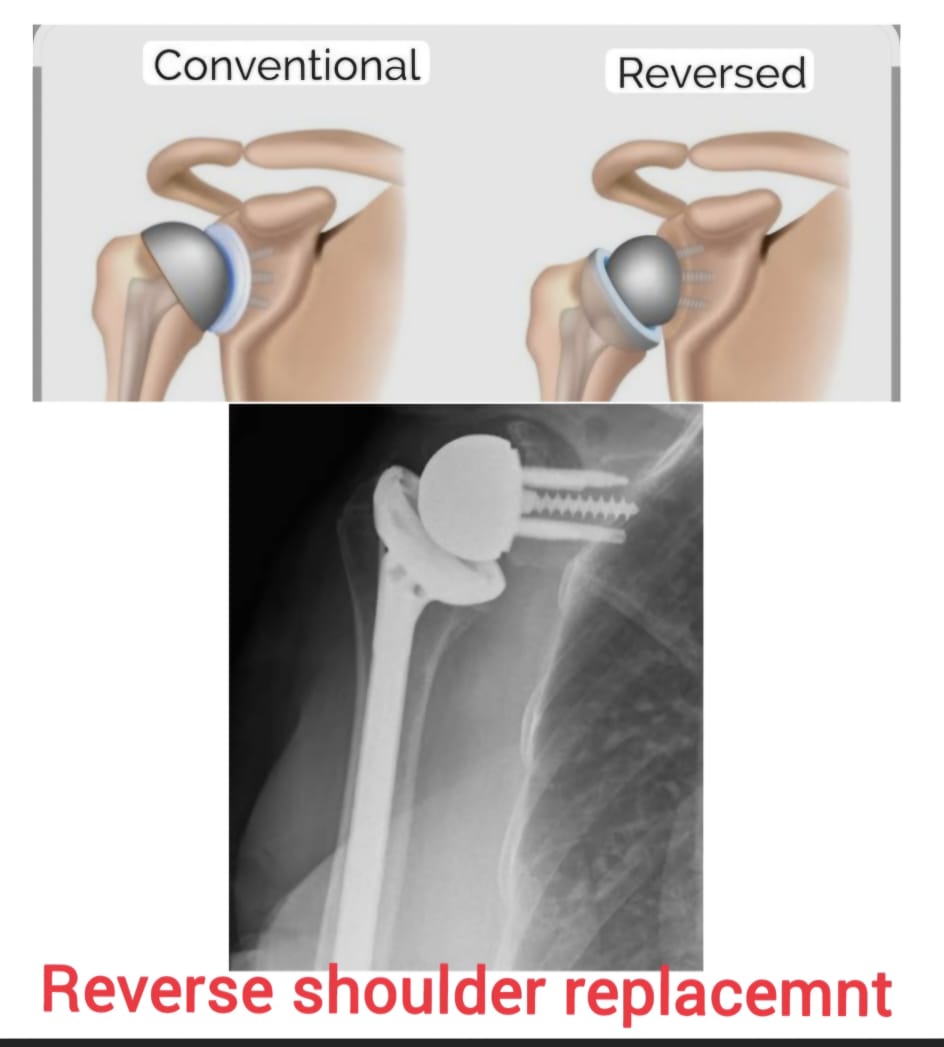 Reverse shoulder replacement is an advanced surgical procedure designed to relieve pain and restore shoulder function in patients with severe rotator cuff damage and complex shoulder conditions. In this procedure, the normal anatomy of the shoulder joint is reversed — the ball component is placed on the socket side, and the socket is placed on the upper arm bone. This design allows the deltoid muscle to take over the function of the damaged rotator cuff.